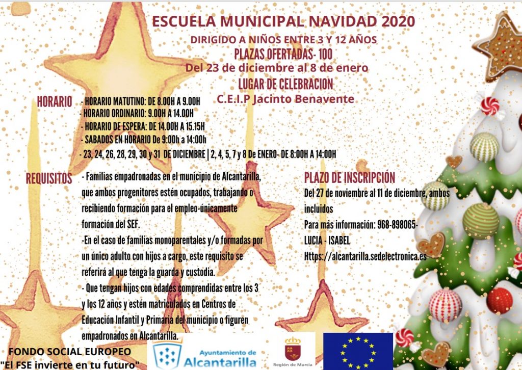 Podrán participar los niños de 3 a 12 años que estén empadronados en Alcantarilla o que estén matriculados en Centros de Educación Infantil y Primaria del municipio, cuyos padres estén trabajando o recibiendo formación en algún curso del Servicio Regional de Empleo y Formación (SEF). En el caso de familias monoparentales o formadas por un único adulto con hijos a cargo, este requisito se referirá al que tenga la guarda y custodia. La lista provisional de admitidos se publicará el 15 de diciembre, el 18 de diciembre la lista definitiva y el 23 de diciembre comienza la Escuela de Navidad.