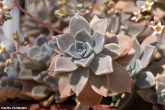 Una modesta planta crasa que tengo en una maceta puede ser todo un espectáculo si sabemos observar. Su nombre es Graptopetalum paraguayense (ID. Eduardo Agüera Bastida) y resulta atractiva para un macho de la abeja Rhodanthidium sticticum, que tiene allí su territorio en espera de que llegue alguna hembra para aparearse con ella. De hecho lo he visto apareándose con una pero, por desgracia, no llevaba la cámara. Seguiré intentándolo…