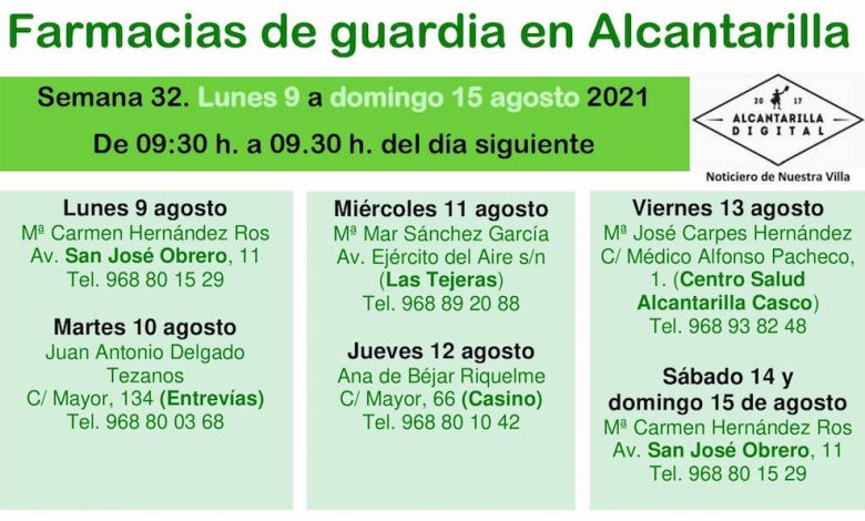 Farmacias de guardia en Alcantarilla del lunes 9 al domingo 15 de agosto de 2021.