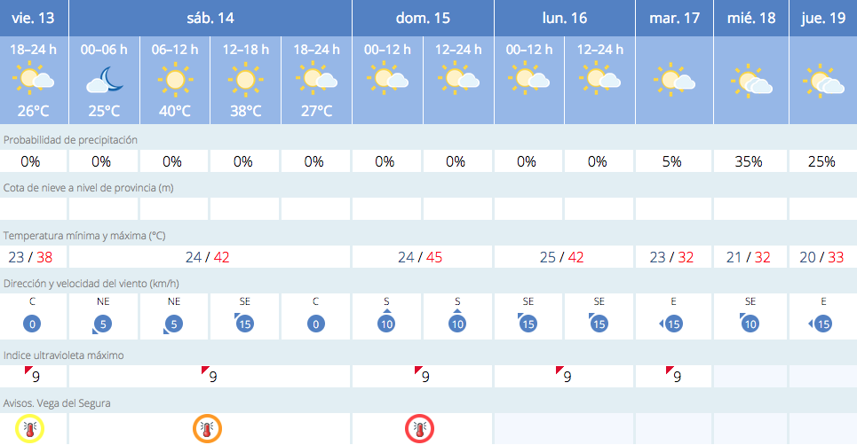 En cuanto al domingo, día 15, la Aemet informa de que las temperaturas podrán llegar a los 44 grados en la Vega del Segura (Alcantarilla), a los 43 en el Altiplano, Noroeste y Valle del Guadalentín, Lorca y Águilas y a los 36 grados en el Campo de Cartagena y Mazarrón. Se informa de fenómenos meteorológicos adversos por altas temperaturas de nivel rojo para la Vega del Segura, naranja para Altiplano, Noroeste y Valle del Guadalentín, Lorca y Águilas y amarillo para el Campo de Cartagena y Mazarrón.