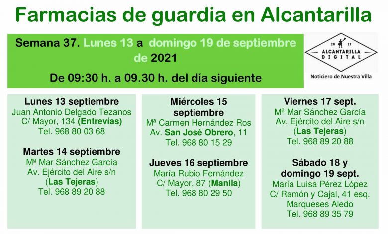 Farmacias de guardia en Alcantarilla del lunes 13 al domingo 19 de septiembre de 2021. De 09:30 h. a 09:30 h. del día siguiente.