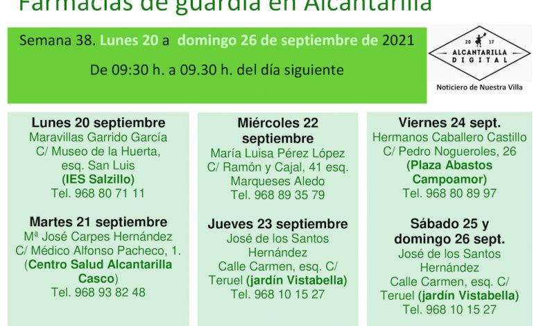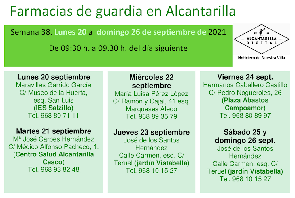 Farmacias de guardia en Alcantarilla del lunes 20 al domingo 26 de septiembre de 2021. De 09:30 h. a 09:30 h. del día siguiente.