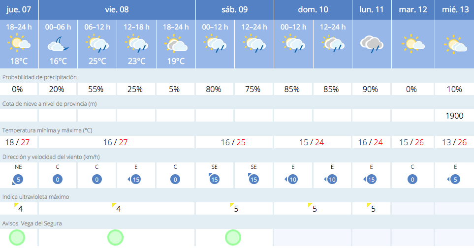 Predicción para los próximos días de la Aemet para Alcantarilla publicada este jueves por la noche
