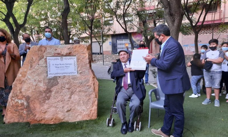 El alcalde, Joaquín Buendía, y el propio Diego de las Flores, descubrieron este jueves esta distinción honorífica, promovida por un grupo de vecinos, que fue aprobada en Pleno en febrero por unanimidad de todos los grupos municipales.