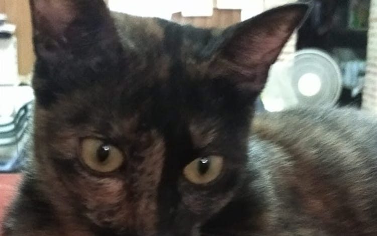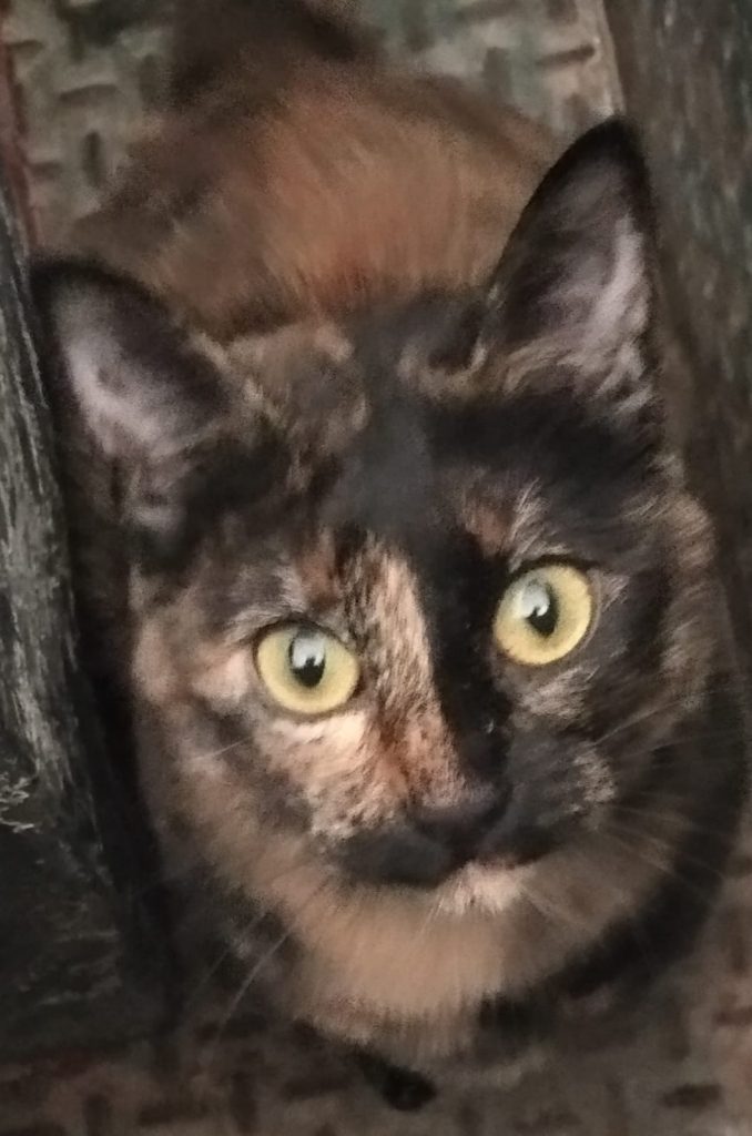 Filomena, Filo, es una gatita de unos dos años, castrada pero no lleva chip. Se perdió el lunes por la tarde junto a la iglesia de San Roque de Alcantarilla. Es muy buena, pero asustadiza y muy independiente, no se deja coger o acariciar fácilmente. La gata es negra con pintas doradas (carey).