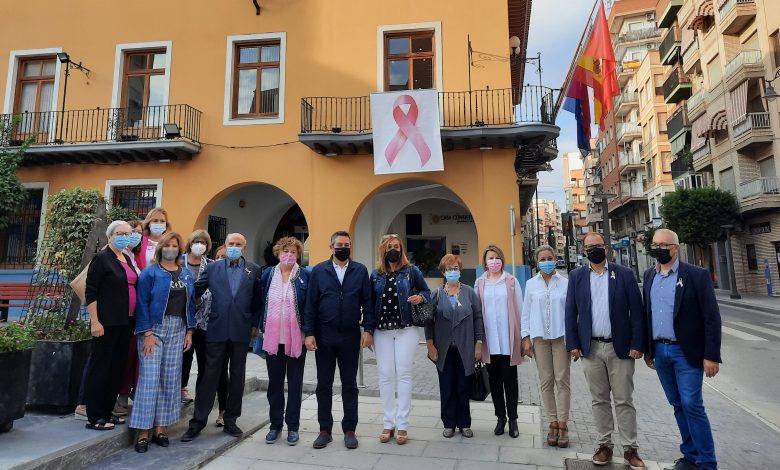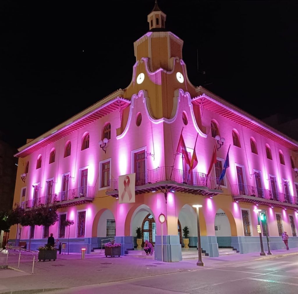 El Ayuntamiento luce un gran lazo rosa en la fachada para visibilizar la lucha contra el cáncer de mama, que han colocado el alcalde, Joaquín Buendía, junto con la presidenta de la junta local de la Asociación Española Contra el Cáncer, María José Ibáñez.