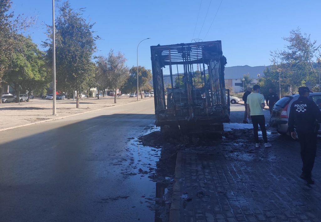 Bomberos de Murcia intervinieron en la mañana del lunes en el incendio de un camión en el Polígono Industrial Oeste. Pese a la actuación de los equipos de extinción, el fuego envolvió por completo al camión, como muestran las imágenes facilitadas por la Policía Local de Murcia.