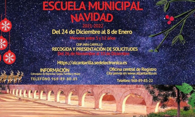 La Escuela de Navidad se celebrará del 24 de diciembre al 8 de enero en el CEIP Jara Carrillo (Calle Médico José Capel, s/n) en horario de 8:00 a 9:00 h. en turno matutino, de 9:00 a 14:00 h. en turno ordinario y de 14:00 a 15:15 h. en turno de espera. Los días 24 y 31 de diciembre y 8 de enero el horario será de 8:00 a 14:00 h. En función de la demanda se establecerá un turno de tarde de 16:00 a 18:00 h.