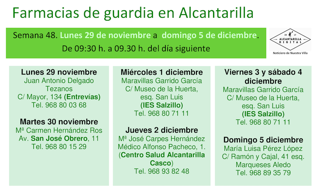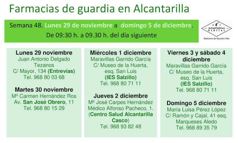 Farmacias de guardia en Alcantarilla del lunes 29 de noviembre al domingo 5 de diciembre de 2021. De 9:30 h. a 9:30 h. del día siguiente.