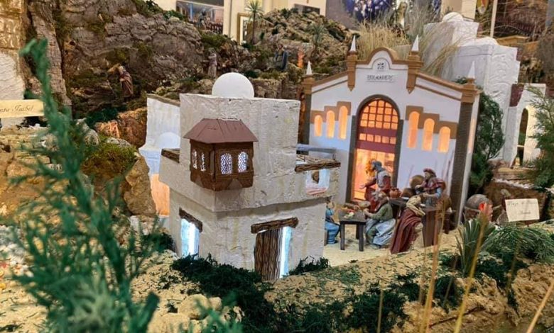 La Noria, el Acueducto, la plaza de Abastos y las iglesias de la Asunción, San Pedro y San Roque, en el belén de la Hermandad de la Virgen de los Dolores