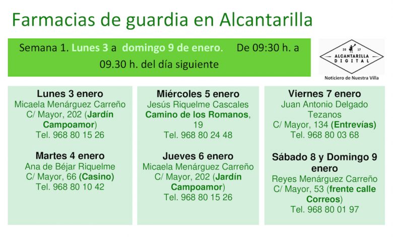 Farmacias de guardia en Alcantarilla del lunes 3 al domingo 9 de enero de 2022. De 9:30 h. a 9:30 h. del día siguiente.