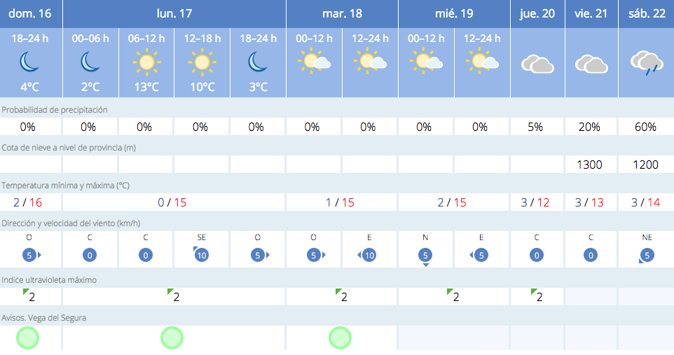 Alcantarilla llegará a los cero grados de temperatura en la madrugada de este lunes 17 de enero según la previsión de la Aemet (Agencia Española de Meteorlogía) para la Región de Murcia.