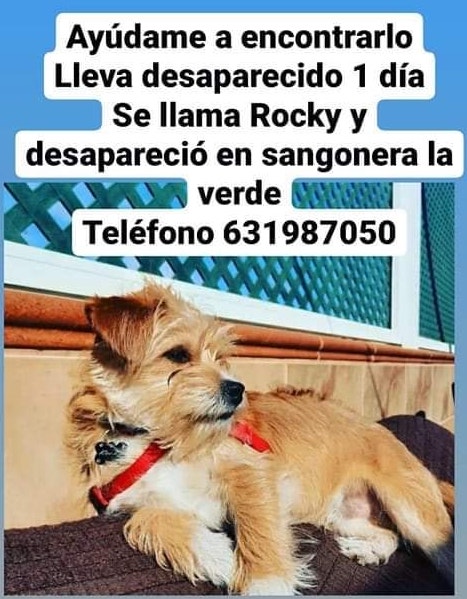 Los dueños de Rocky buscan a su perrito, que se perdió en Sangonera la Verde. Han difundido en redes sociales su foto y un teléfono para avisar en caso de que alguien lo vea: el 631 98 70 50. El aviso, en Facebook, ha sido compartido en la página de la Policía Local de Alcantarilla.