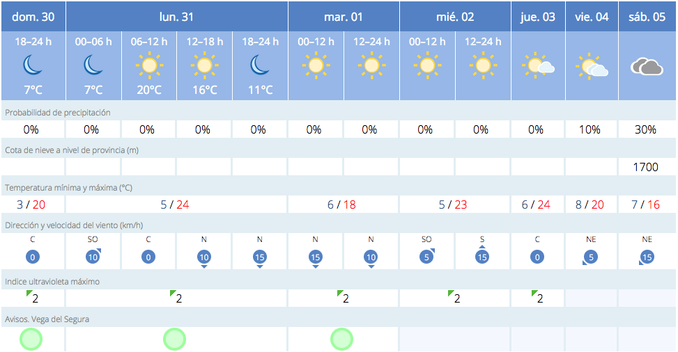 Las borrascas del norte de España cuyos efectos residuales hicieron bajar notablemente las temperaturas en nuestra Región se han ido y ya hay sol en toda España. Tras un periodo breve y de escasas lluvias aunque con algunas heladas débiles (que no bajaron de cero grados en Alcantarilla) comenzamos una semana que estará dominada por el radiante sol invernal murciano acompañado de temperaturas que llegarán, por ejemplo hoy lunes, hasta nada menos que 24 grados centígrados.