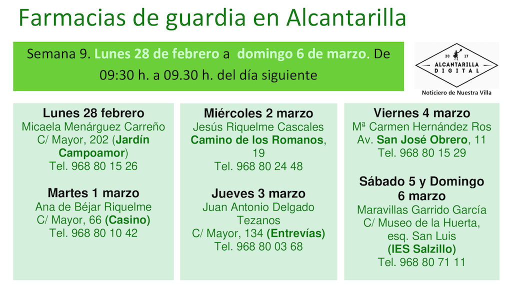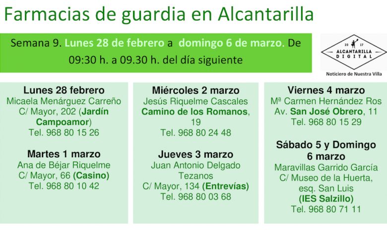Farmacias de guardia en Alcantarilla del lunes 28 de febrero al domingo 6 de marzo de 2022. De 9:30 h. a 9:30 h. del día siguiente.