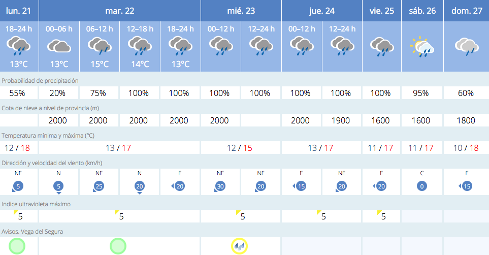 Cuando aún no nos han dejado las lluvias, un nuevo frente de precipitaciones afectará a la Región, lluvias que durarán toda la semana, pues la predicción a siete días de la Aemet, de lunes a domingo, indica lluvia en todos los días, entre el 60 y el 100% de probabilidad.