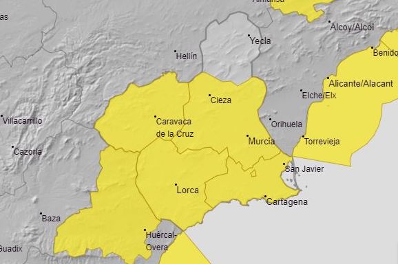 Además, para este miércoles la Aemet ha emitido aviso de fenómenos meteorológicos adversos de nivel amarillo para toda la Región excepto la comarca del Altiplano. El aviso de nivel amarillo señala probabilidad de lluvias intensas de hasta 15 litros por metro cuadrado en tan solo una hora. La concentración en tan corto espacio de tiempo implica posibilidad de inundaciones localizadas y arrastres.