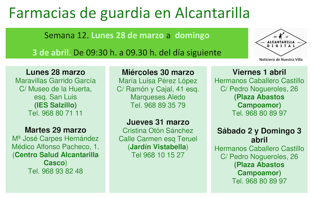 Farmacias de guardia en Alcantarilla del lunes 28 de marzo al domingo 3 de abril de 2022. De 9:30 h. a 9:30 h. del día siguiente.