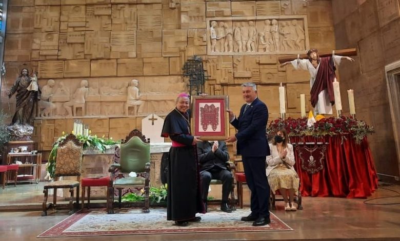 El Nuncio Apostólico de la Santa Sede, Bernardito Cleopas, ha visitado Alcantarilla por segunda vez en los últimos meses. Este domingo asistía en la iglesia de San Pedro al acto de la Hermandad de San Pedro Apóstol y Santísimo Cristo de la Esperanza en el que le hacía entrega del Gallo de Oro, la máxima distinción de la Hermandad. En el mismo acto la Hermandad también entregó al Nuncio el título de Hermano Mayor Honorífico.