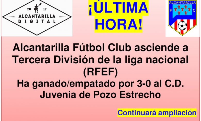 Alcantarilla Fútbol Club ya está en Tercera División tras ganar esta tarde del sábado al CD Juvenia de Pozo Estrecho por 3-0. Consigue así el ascenso directo a la categoría nacional (RFEF). Desde los años 80 del siglo pasado ningún equipo de Alcantarilla ha militado en esta categoría.