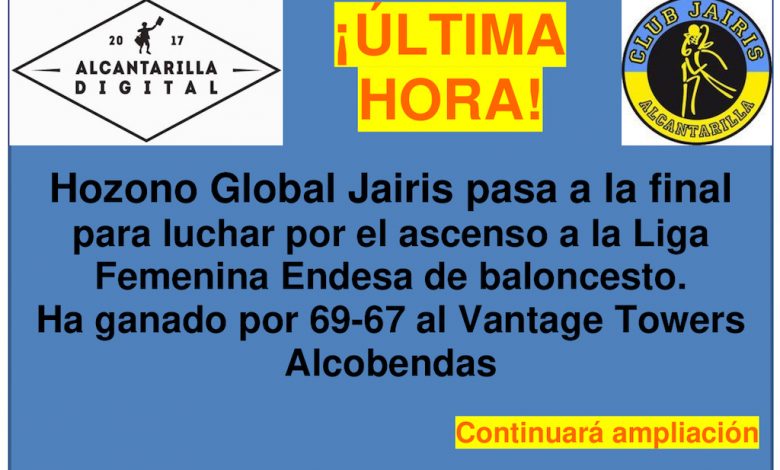 El equipo junior femenino del Club Baloncesto Jairis, el Hozono Global Jairis está más cerca del ascenso a la LF Endesa tras ganar este sábado por la tarde por un ajustado 69-67 al Vantage Towers Alcobendas. Este domingo 1 de mayo el equipo de Alcantarilla será uno de los dos finalistas que lucharán por el ascenso.