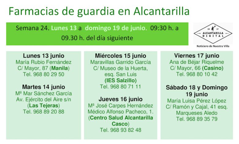 Farmacias de guardia en Alcantarilla del lunes 13 al domingo 19 de junio de 2022. De 9:30 h. a 9:30 h. del día siguiente.