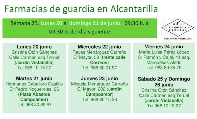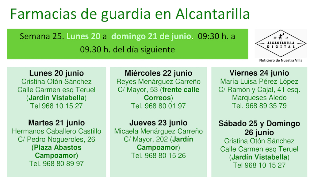 Farmacias de guardia en Alcantarilla del lunes 20 al domingo 26 de junio de 2022. De 9:30 h. a 9:30 h. del día siguiente.