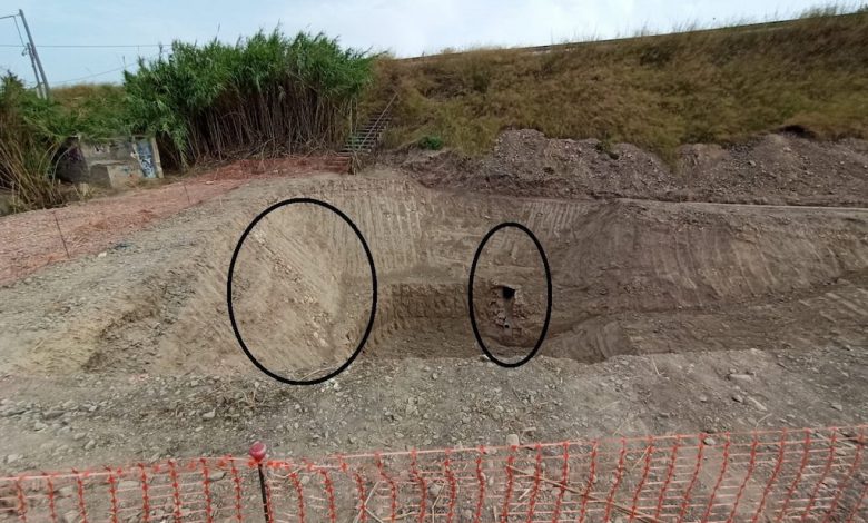 Tras tener información del hallazgo, miembros de Legado visitaron la zona y comprobaron que se trata de una estructura hidráulica histórica que ha quedado al descubierto en las obras de excavación del corredor ferroviario del Mediterráneos en la zona del Pago de las Viñas, muy cerca de la actual estación de mercancías de Nonduermas.