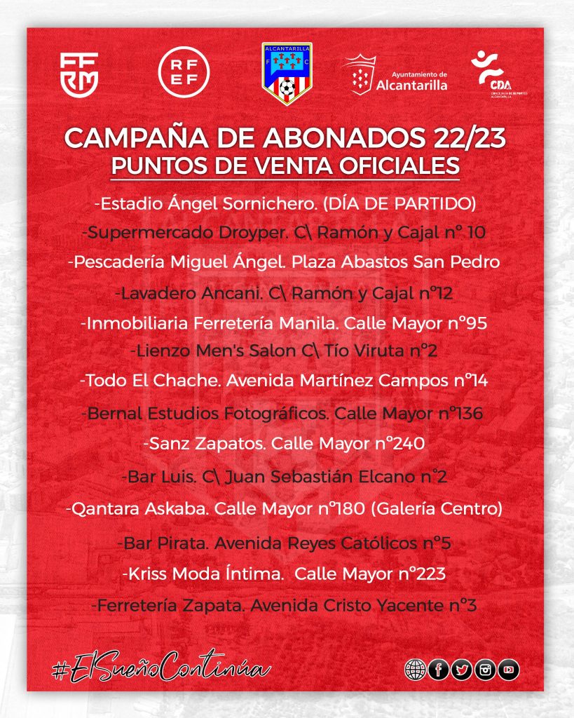 Mientras, el club pisa el acelerador en la venta de abonos de temporada. Los abonos se podrán adquirir en el estado Ángel Sornichero de Alcantarilla, donde juega el club, durante los días de partido. Y además hay ya 13 establecimientos comerciales y de servicios de nuestro municipio en los que se pueden adquirir los abonos.