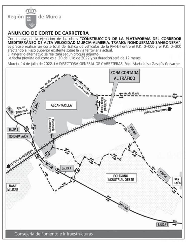 El corte se hará efectivo a partir de mañana miércoles por la mañana. En la práctica supone cortar la principal vía de acceso desde Alcantarilla al Polígono Industrial. Como alternativas están el acceso a la RM-E4 desde el paso del Recinto de Fiestas o desde el paso del Camino de los Romanos. El camino de la Voz Negra permanecerá abierto.