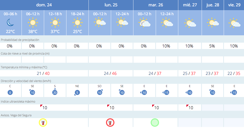 La Aemet ha emitido para hoy domingo y mañana lunes alerta meteorológica con nivel de aviso máximo por riesgo extremo debido a las altas temperaturas en nuestra ciudad y en la Región, que llegarán a los 40 grados hoy domingo y que se espera puedan llegar a los 46 grados centígrados mañana lunes 25 de julio.