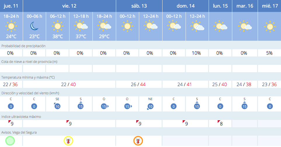 El aviso naranja ha sido emitido para las comarcas de la Vega del Segura (que incluye Alcantarilla), Valle del Guadalentín, Lorca y Águilas, por temperaturas previstas de hasta 43 grados, que localmente pueden llegar a 44 grados, mientras que para las comarcas de Altiplano y Noroeste se espera que el termómetro no pase de los 40 grados centígrados.