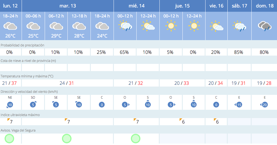 La probabilidad de lluvia aumenta el miércoles, hasta un 65%, el sábado (85%) y el domingo (80%). Pero lo más significativo será el descenso de las temperaturas. Y aunque las mínimas se mantendrán altas, en torno a los veinte grados, a las máximas les costará pasar de los treinta grados (28º centígrados previstos de máxima para el domingo, por ejemplo).