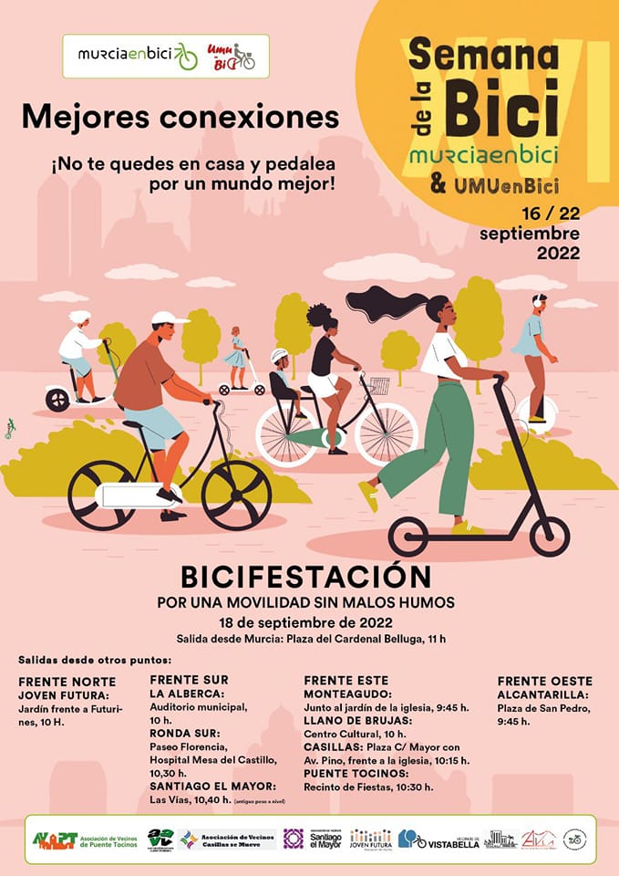 La bicifestación está convocada por Murcia en Bici y apoyada por entidades como asociaciones de vecinos de diversos barrios y la propia Federación de Asociaciones de Vecinos.