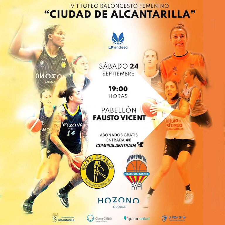El IV Trofeo de Baloncesto Ciudad de Alcantarilla enfrentará este sábado 24 en el pabellón Fausto Vicent al Hozono Global Jairis y al Valencia Basket Club, a partir de las 19:00h. Sin duda será un partido de especial trascendencia para el club alcantarillero, al medirse al actual subcampeón de la Liga Femenina Endesa, máxima categoría del baloncesto nacional, donde debutarán esta temporada tras el ascenso logrado el pasado 1 de mayo en la final Four de la LF Challenge, celebrada en Alcantarilla.