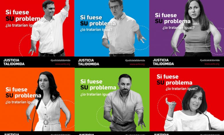‘Justicia talidomida’, la nueva campaña de Avite, supone una vuelta de tuerca más en el enfrentamiento entre la organización nacional que representa a los afectados y el Gobierno central. Y el escenario no son esta vez los tribunales o el Congreso de los Diputados, sino la imagen fotográfica de los políticos con extremidades deformadas, tal y como les ocurre a los afectados por la talidomida. Las imágenes, que son claramente un montaje denuncia, muestran a diez políticos: Pedro Sánchez y la ministra de Sanidad, Carolina Darías (PSOE); Alberto Núñez Feijóo y Ana Pastor (PP); Pablo Iglesias, Pablo Echenique y Ione Belarra (Podemos); Inés Arrimadas y Edmundo Val (Ciudadanos); y a Santiago Abascal (Vox).