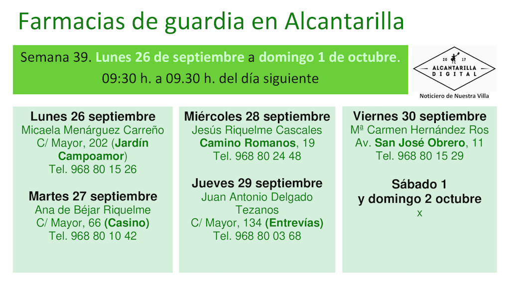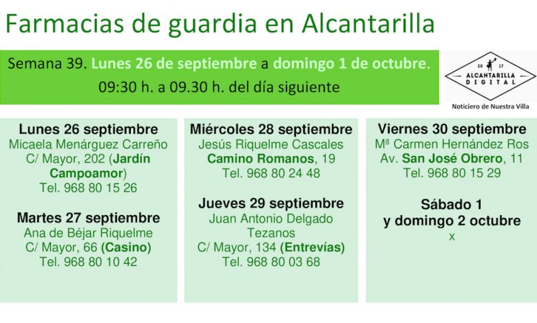 Farmacias de guardia en Alcantarilla del lunes 26 al viernes 30 septiembre de 2022. De 9:30 h. a 9:30 h. del día siguiente.