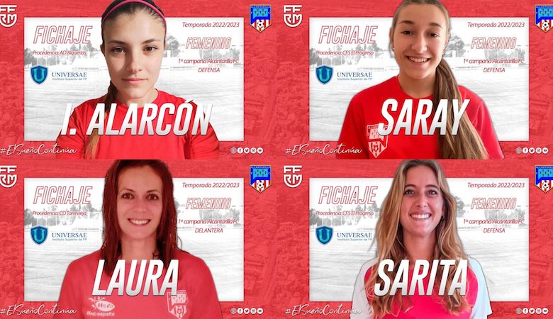 Alcantarilla FC ha reforzado su equipo femenino, que lidera la clasificación de Primera Autonómica Femenina con cuatro fichajes más. Alarcón, procedente del AD Alquerías, jugará como defensa; Saray también estará en la defensa, procedente del CFS El Progreso; Laura proviene del CD Torrevieja y jugará como delantera; y Sarita, que también procede del CFS El Progreso, será también jugadora en la defensa.