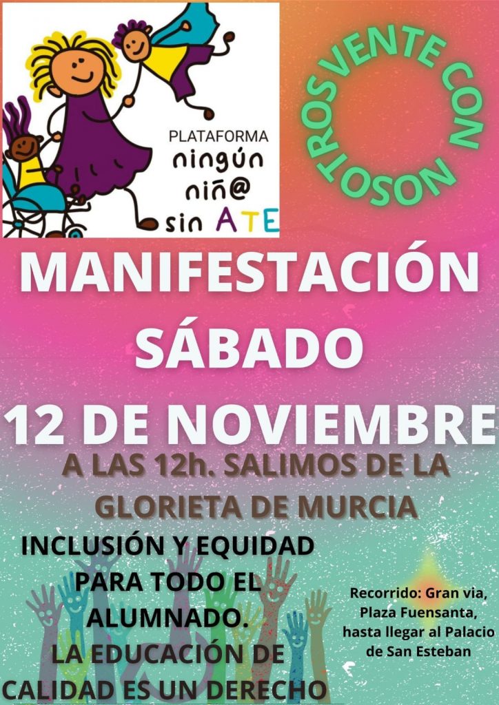 Estas acciones de protesta en las puertas de los colegios se complementan con movilizaciones de mayor envergadura, como la manifestación que hay convocada en Murcia para este sábado 12 de noviembre a las 12:00 h. que saldrá de la Glorieta con el lema ‘Inclusión y equidad para todo el alumnado’.