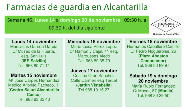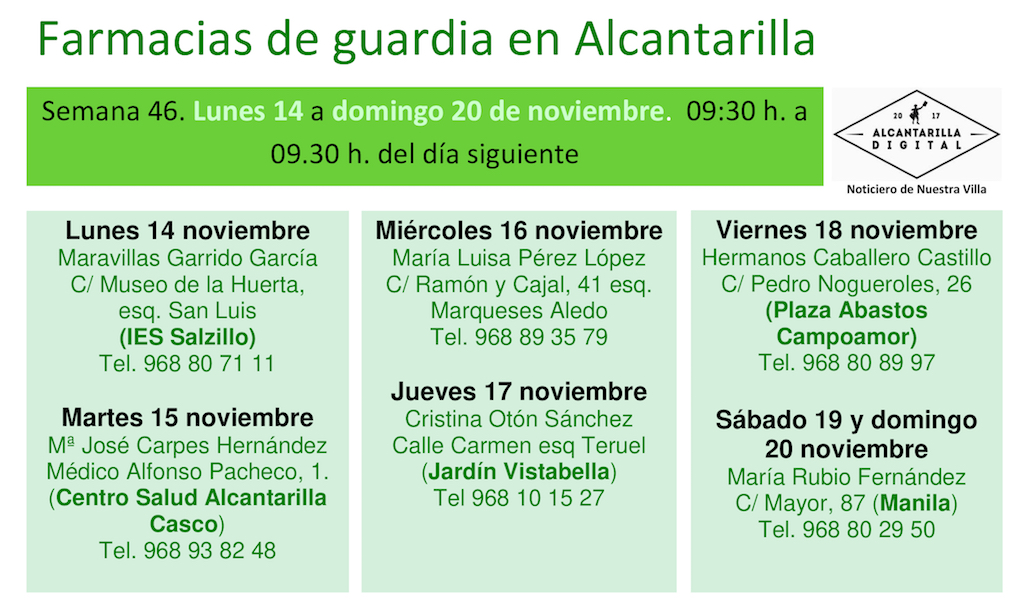 Farmacias de guardia en Alcantarilla del lunes 13 al domingo 20 de noviembre de 2022. De 9:30 h. a 9:30 h. del día siguiente.