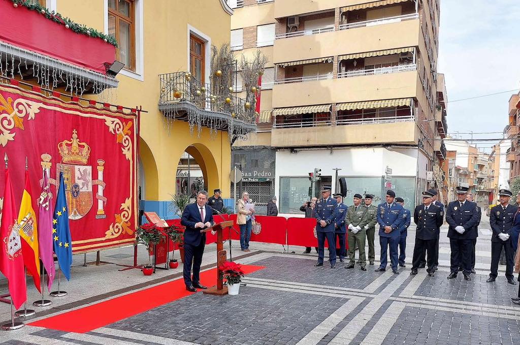 El acto que se ha desarrollado un año más en la plaza de San Pedro, junto al Ayuntamiento, contó también con la presencia de los coroneles jefes de la Base Aérea de Alcantarilla, Regimiento de Infantería Zaragoza 5 de Paracaidistas y del EZAPAC, junto del Cuerpo Nacional de Policía y Policía Local, así como diferentes presidentes y representantes de las asociaciones, colectivos y entidades de nuestro municipio y vecinos que han querido unirse a este homenaje,