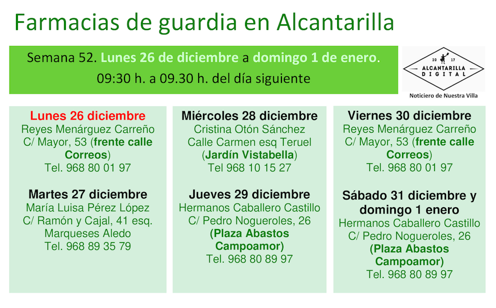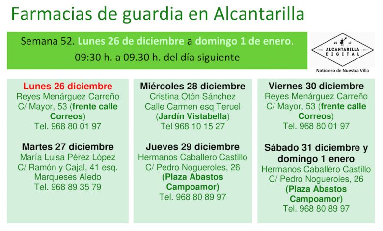 Farmacias de guardia en Alcantarilla del lunes 26 de diciembre de 2022 al domingo 1 de enero de 2023. De 9:30 h. a 9:30 h. del día siguiente.