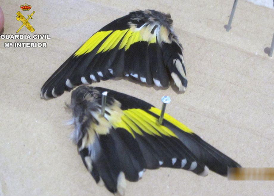 En la finca, también se hallaron varias alas de jilguero (especie protegida), colocadas para ser disecadas en unas planchas de madera, supuestamente empleadas para la ornamentación de alguna de las herramientas y útiles. Por ello, se les atribuye un delito contra la flora, fauna y animales domésticos.