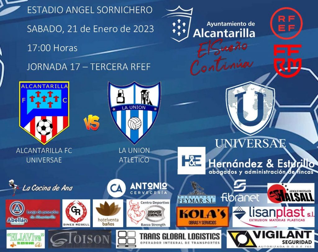 El equipo masculino recibirá en el estadio Ángel Sornichero (sábado 21 de enero a las 17:00 h.) a La Unión Atlético. Un partido difícil teniendo en cuenta que Alcantarilla FC está en una parte delicada de la clasificación, asomándose a la zona de descenso y, además, a quien recibe es al segundo clasificado. El equipo ha cambiado de entrenador durante el descanso navideño con la salida de Víctor Pagán y el regreso de Juan Antonio Pelegrín, Carnizas, que durante varias temporadas fue entrenador antes de Pagán. Por tanto, un partido decisivo en una situación compleja y ante un rival fuerte. El factor campo es, a priori, la ventaja de los alcantarilleros, que este sábado necesitarán más que nunca del apoyo de la afición para afrontar el encuentro.