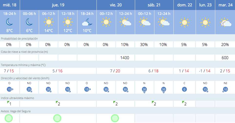 La predicción de la Aemet para los próximos siete días en Alcantarilla señala que la temperatura mínima el domingo será de 1 grado y que en la madrugada del lunes puede llegar a un grado bajo cero. Si tenemos en cuenta que esa tendencia seguirá en los días siguientes, con uno o dos grados de mínima nocturna, puede llegar a haber heladas en la huerta que afecten a los cítricos.