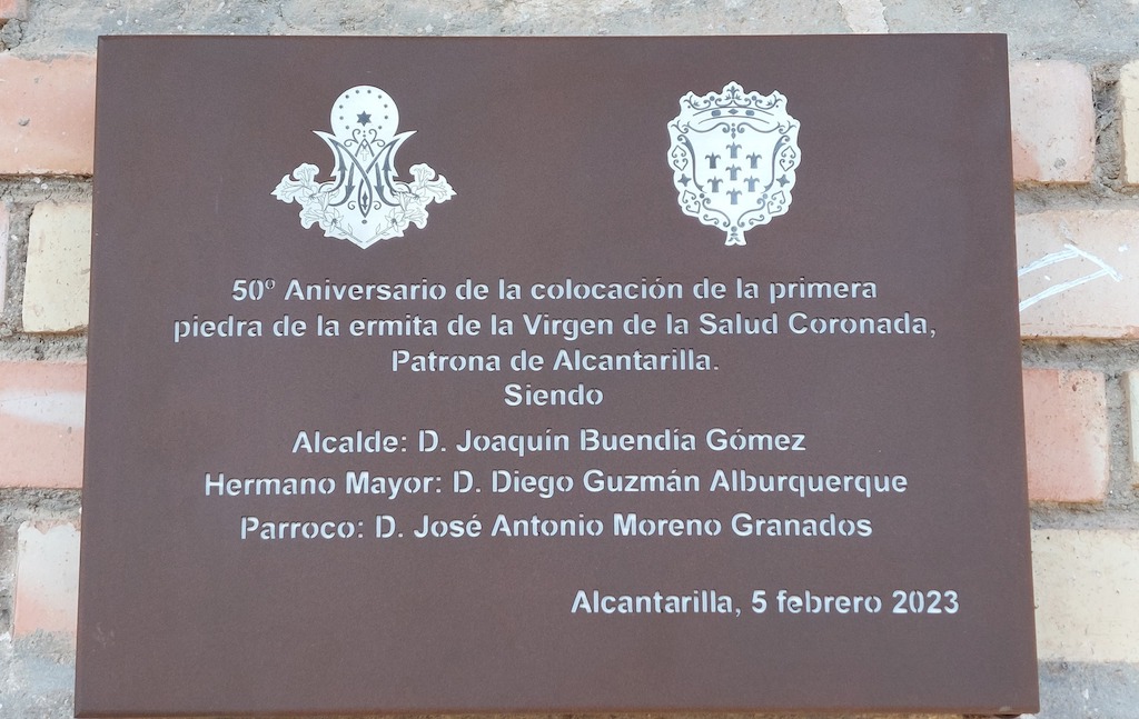 El alcalde de Alcantarilla, junto con el Hermano Mayor de la Hermandad de la Virgen de la Salud, Diego Guzmán, descubrieron la placa conmemorativa de este 50 aniversario, tras la misa en honor a la Virgen de la Salud, que es la patrona de la ciudad de Alcantarilla y alcaldesa de honor desde 1955.