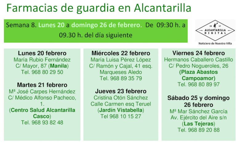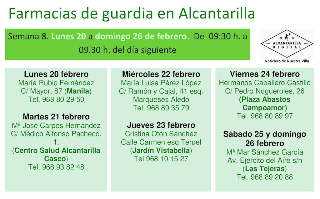 Farmacias de guardia en Alcantarilla del lunes 20 al domingo 26 de febrero de 2023. De 9:30 h. a 9:20 h. del día siguiente.