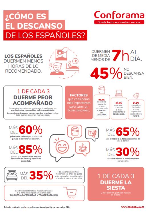 El 44,8% de los españoles no descansa bien y duerme de media menos de 7 horas al día. Así se desprende del último estudio realizado por Conforama, firma de equipamiento del hogar y especializada en colchones, que ha analizado los hábitos de descanso en nuestro país. Por regiones, las comunidades del Levante y sur de la Península (Murcia, Comunidad Valenciana, Andalucía y Extremadura) reconocen no descansar bien en un 44,5% de los encuestados y dormir 7 horas diarias, una cifra similar a la media española. Se sitúan por detrás de las comunidades del centro peninsular (Madrid, Castilla y León y Castilla-La Mancha) con cerca del 47% que duerme mal, y el Noreste (Aragón, Baleares y Cataluña), con un 45,3%.