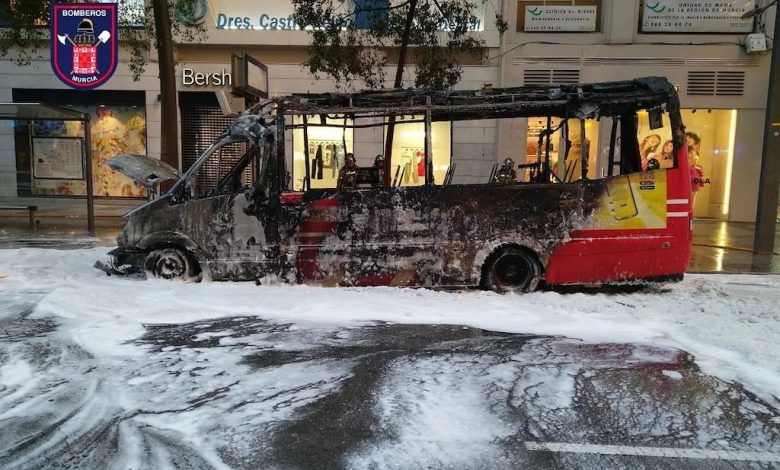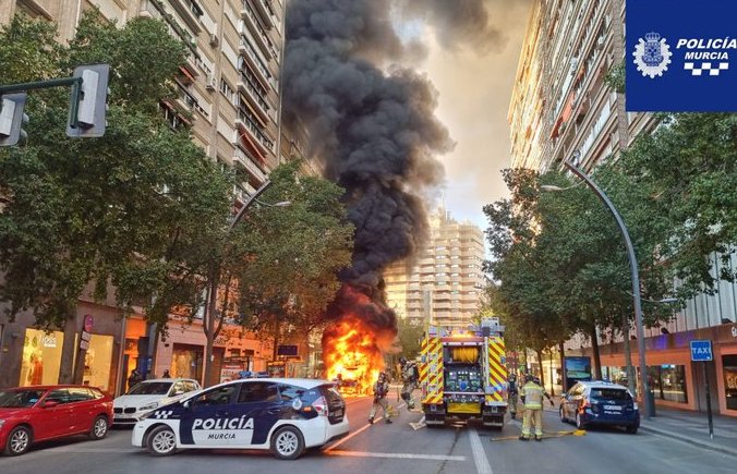 Un autobús del servicio de transporte urbano de Murcia de la empresa Monbus ardió por completo en la tarde de este jueves en la Gran Vía de Murcia. El autobús, que formaba parte de la flota de los llamados ‘coloraos’ y que iba propulsado por gas natural comprimido, ardió por motivos que se desconocen en la Gran Vía de Murcia entre las calles Almudena y Acisclo Díaz, sobre las seis y media de esta tarde de este jueves.
