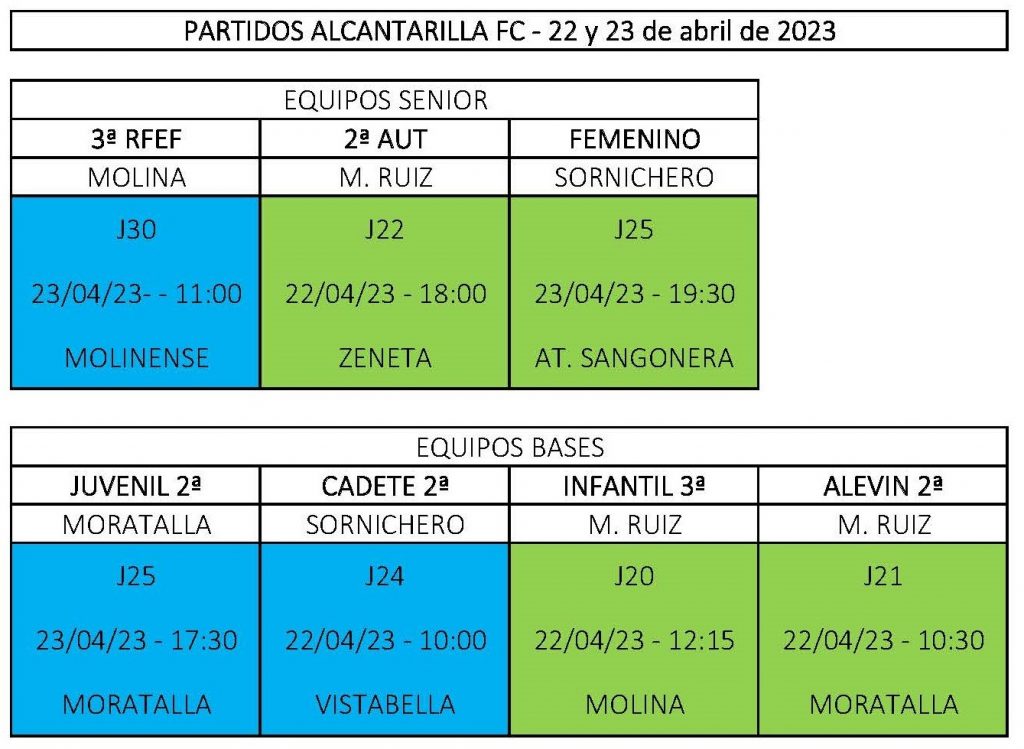 Los dos equipos senior del Alcantarilla FC, el masculino y el femenino, cerrarán la temporada con partidos fuera de casa. El equipo masculino se desplaza este domingo a Molina y el femenino juega también este domingo en casa la penúltima jornada contra el Atlético Sangonera, y la última visitará al EF Dolorense B.